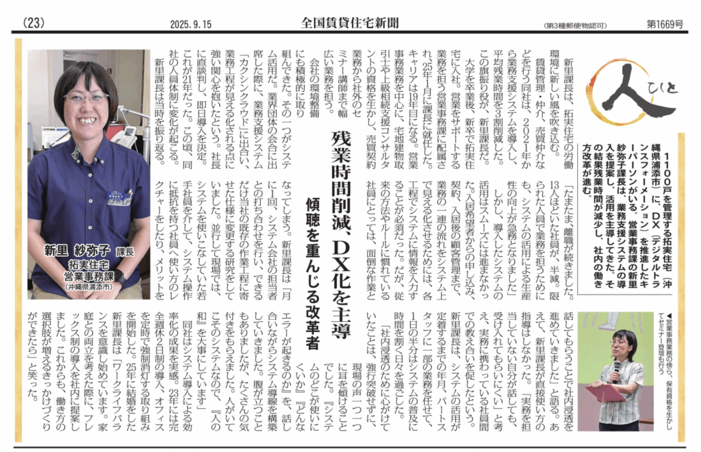 「全国賃貸住宅新聞(2025.9.1:第1667号、2025.9.15:第1669号)」にて、弊社ユーザー様である有限会社拓実住宅様、社内推進者様の記事が掲載されました!カクシンクラウドのトピックスはもちろん、「働き方改革」の取り組みが掲載され、「残業3割減」など着実に成果として出てきておられます。DX化の目的が明確であり、推進者様を中心とした既存従業員の定着を目指した様々な取り組みが掲載されています。